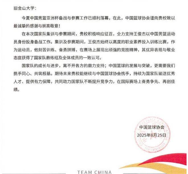 中国篮协给旧金山大学发去感谢信:感谢对王俊杰的培养