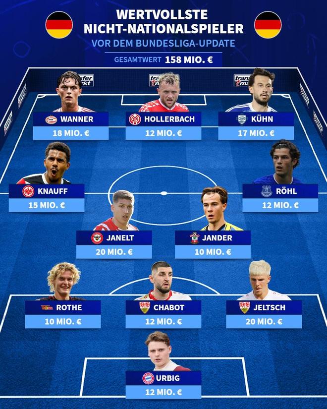 从未入选过国家队的德国最贵11人阵容:乌尔比希、万纳在列